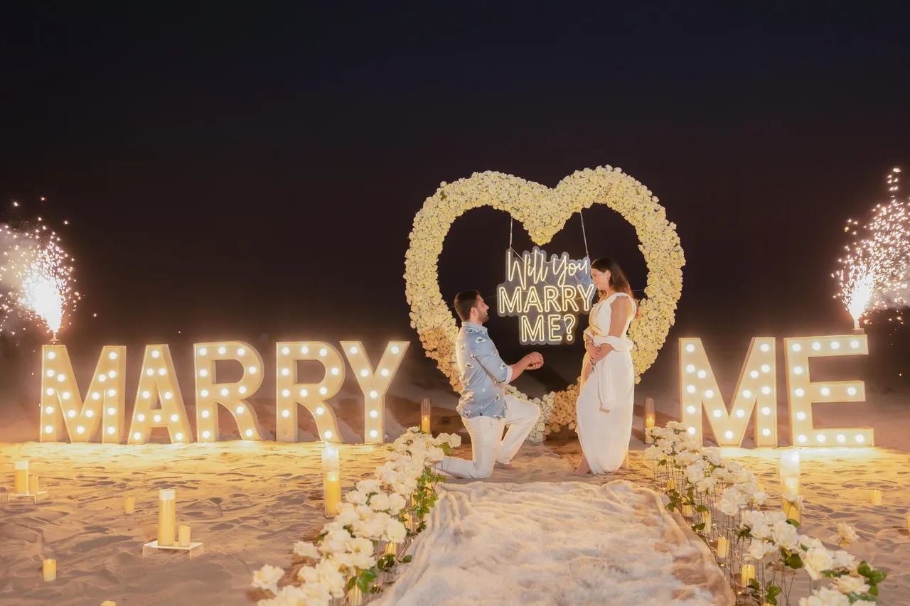Picture this: the gentle sea breeze, the sun kissing the horizon, and a heart-stopping moment as your partner reads exactly what’s in your heart—engraved in sand, illuminated